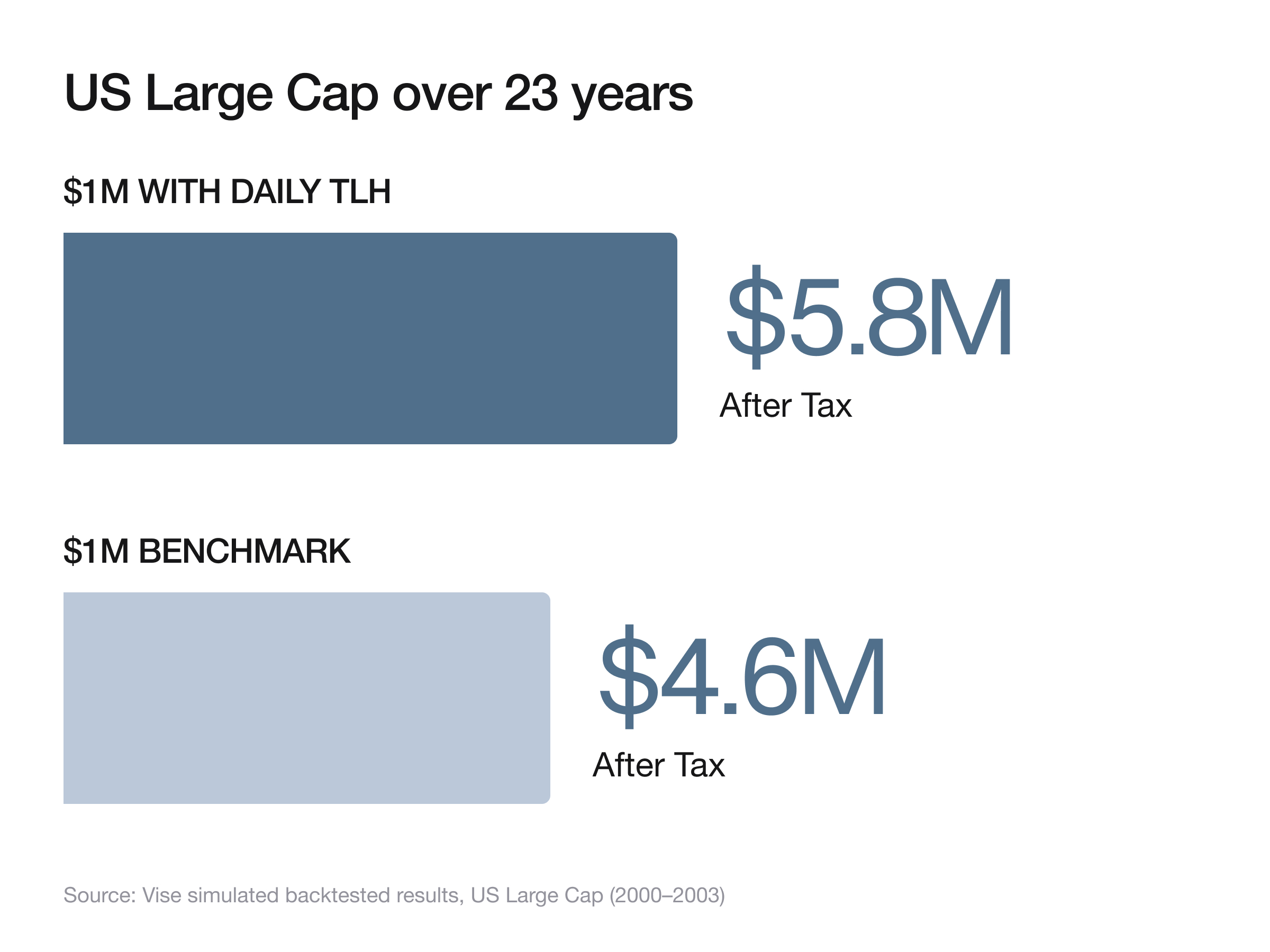 In US Large Cap, daily single-stock harvesting has generated an average of +3.0% annual tax alpha. Over 23 years, that has the potential to turn $1M into $5.8M after tax, compared to $4.6M for the benchmark after tax. That's $1.2M in additional portfolio value from tax alpha alone.2