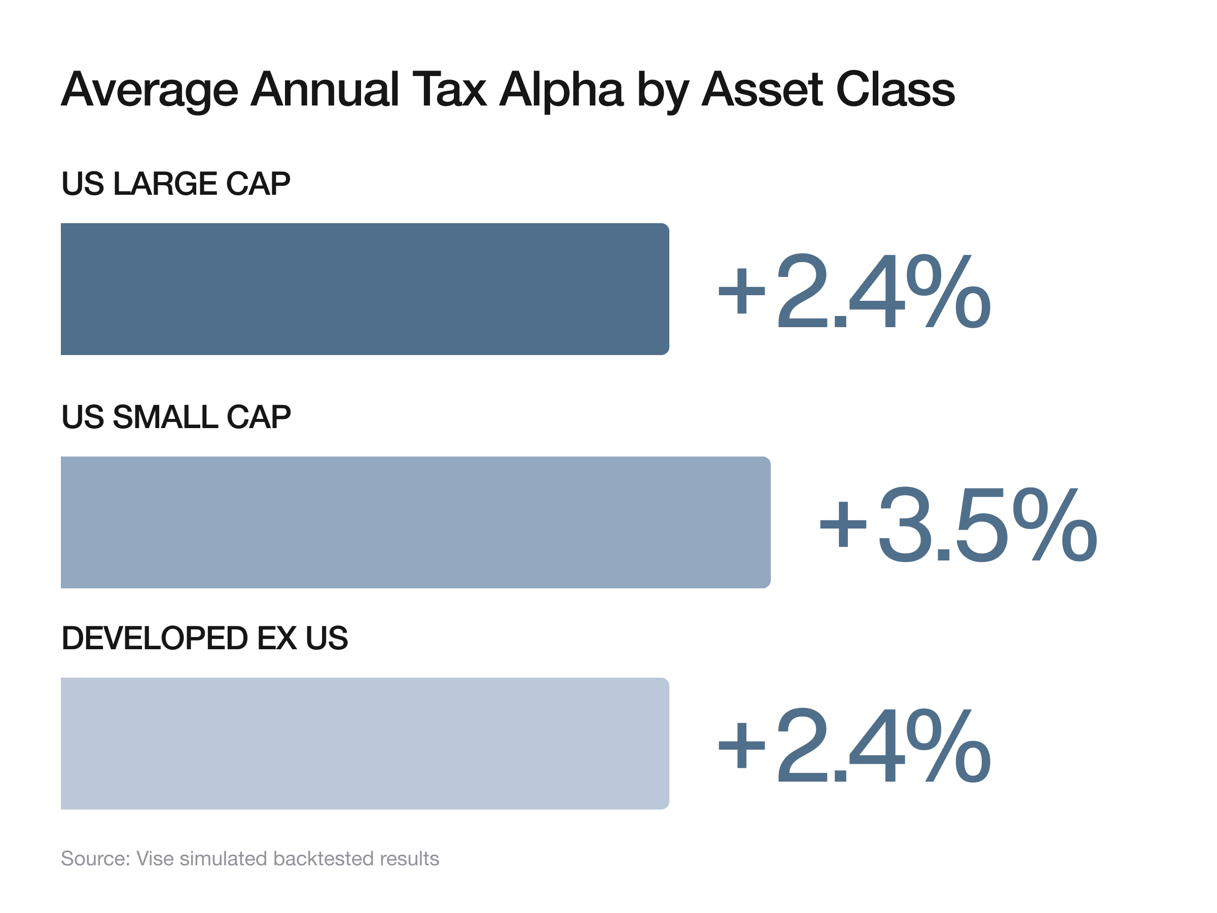 2 Asset class tax alpha performance. Vise simulated backtested results. US Large Cap and US Small Cap simulations use an inception date of June 2000; Developed ex-US (via US-listed ADRs tracking MSCI EAFE) uses an inception date of 2008. Tax alpha calculated by assuming net realized losses offset equivalent gains at a 37% short-term and 20% long-term marginal tax rate, with tax savings reinvested. Simulations are rebalanced monthly. These results are hypothetical, do not reflect actual client accounts, and are subject to backtesting limitations. Actual results vary based on starting portfolio, inception period, inflows/outflows, and individual client tax rates.