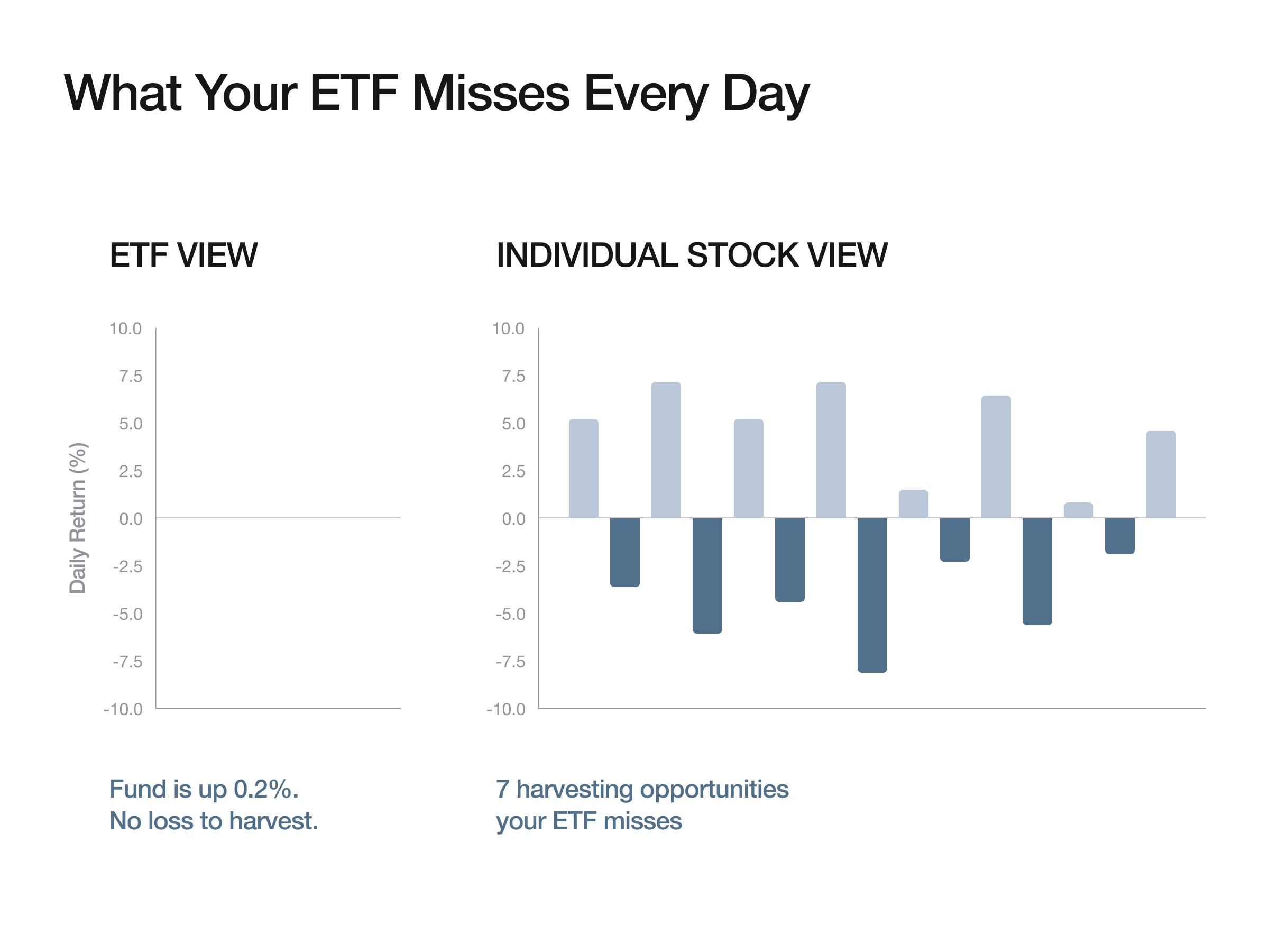 But ETF-level harvesting has a hard ceiling. You can only harvest a loss when the entire fund is down. Inside that fund, individual stocks are moving in different directions every day. Some are up 5%. Some are down 8%. At the fund level, those movements net out. At the individual stock level, every one of them is a potential harvesting opportunity.